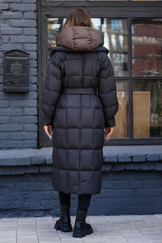 Приталенный пуховик с поясом, удлиненная модель с наполнителем пух-перо. Идеально подходит для холодной зимы, качестенный полиэстер с пропиткой от влаги. Оптимальная длина и классический фасон.