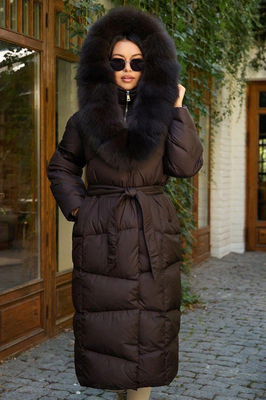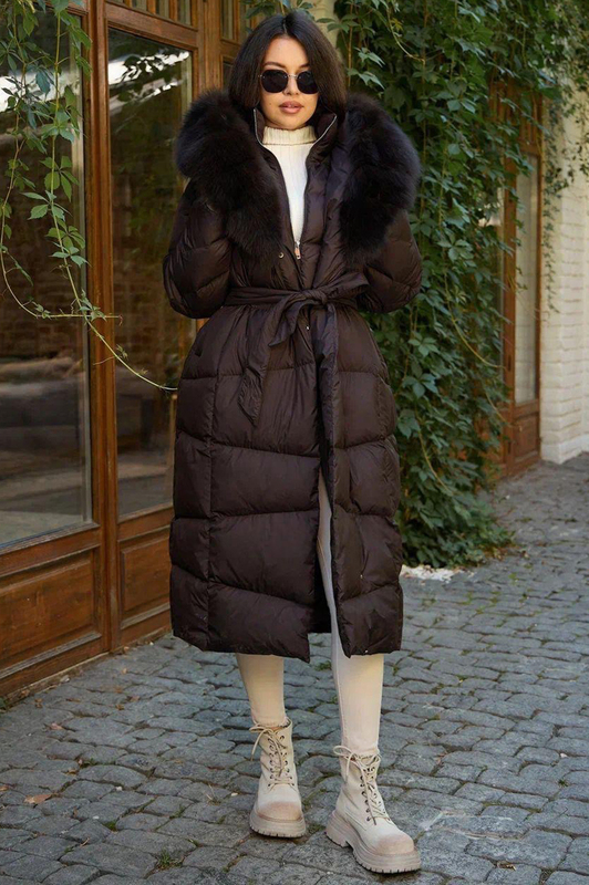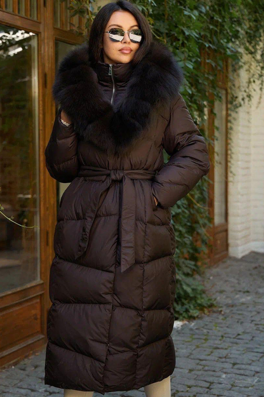 Приталенный пуховик с поясом, удлиненная модель с наполнителем пух-перо. Идеально подходит для холодной зимы, качестенный полиэстер с пропиткой от влаги. Оптимальная длина и классический фасон.