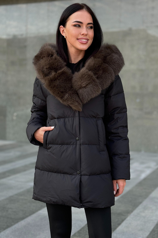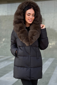 Женская куртка сшита из ткани с пропиткой с утеплителем пух-перо. Пуховик с фасоном оверсайз хорошо садится на фигуры различного типа. Воротник украшает шикарный мех натурального песца.