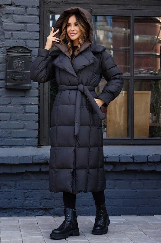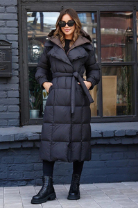 Приталенный пуховик с поясом, удлиненная модель с наполнителем пух-перо. Идеально подходит для холодной зимы, качестенный полиэстер с пропиткой от влаги. Оптимальная длина и классический фасон.