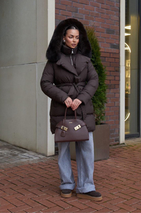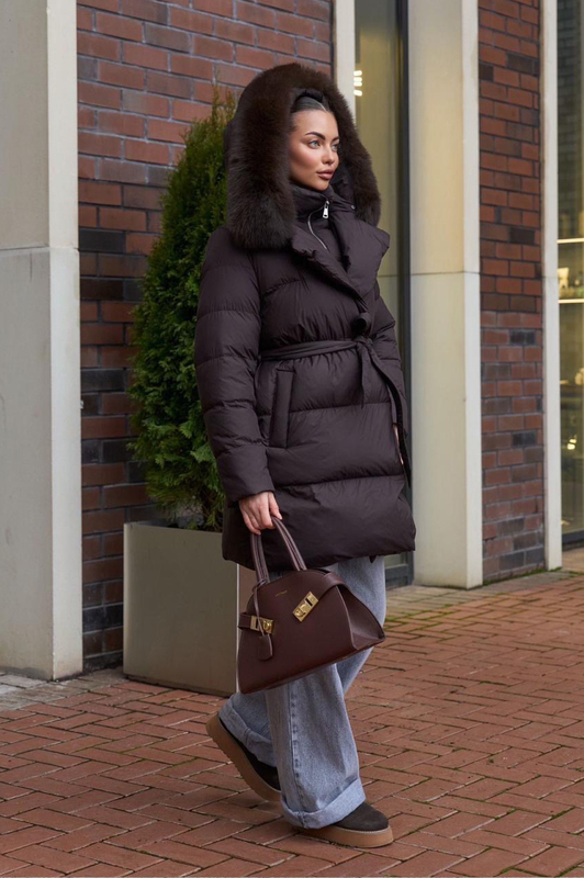 Приталенный пуховик с поясом, удлиненная модель с наполнителем пух-перо. Идеально подходит для холодной зимы, качестенный полиэстер с пропиткой от влаги. Оптимальная длина и классический фасон.