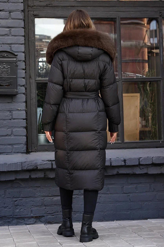Приталенный пуховик с поясом, удлиненная модель с наполнителем пух-перо. Идеально подходит для холодной зимы, качестенный полиэстер с пропиткой от влаги. Оптимальная длина и классический фасон.
